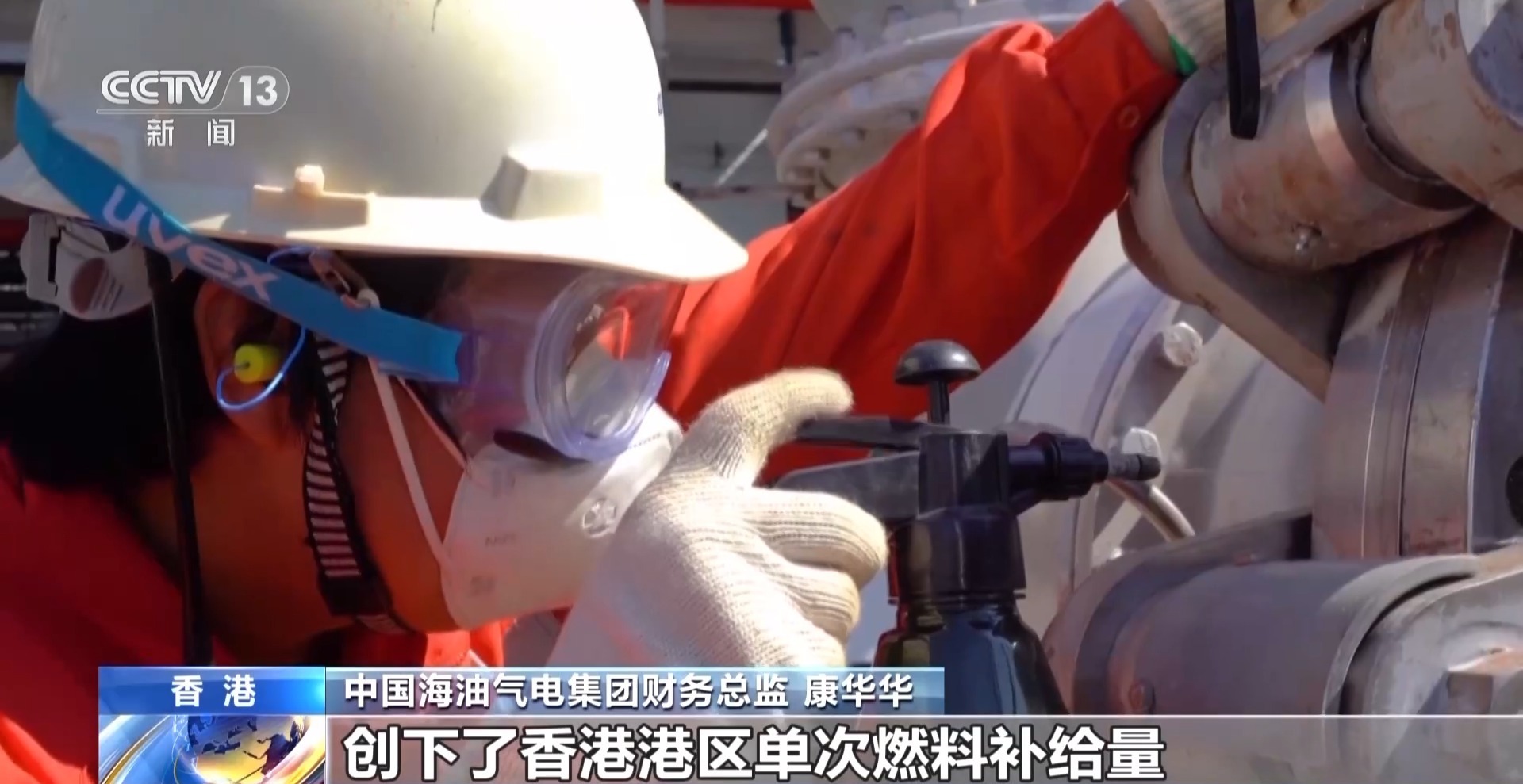 中国海油气电集团财务总监 康华华:通过智能化监控系统,我们仅用八个半小时就完成了天然气加注,不仅满足了该船全部航程的燃料需求,更大大缩短了港口周转时间,创下了香港港区单次燃料补给量、加注效率的新纪录。这是香港首次在码头进行船舶液化天然气加注,也是首次开展燃料补给与货物装卸同步作业。